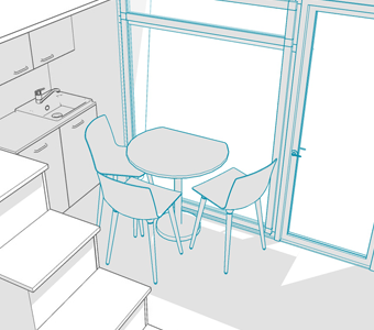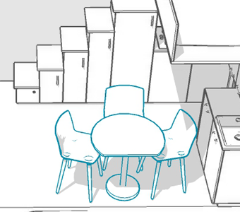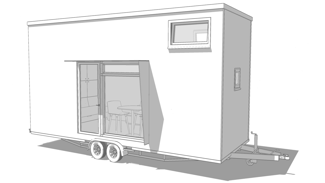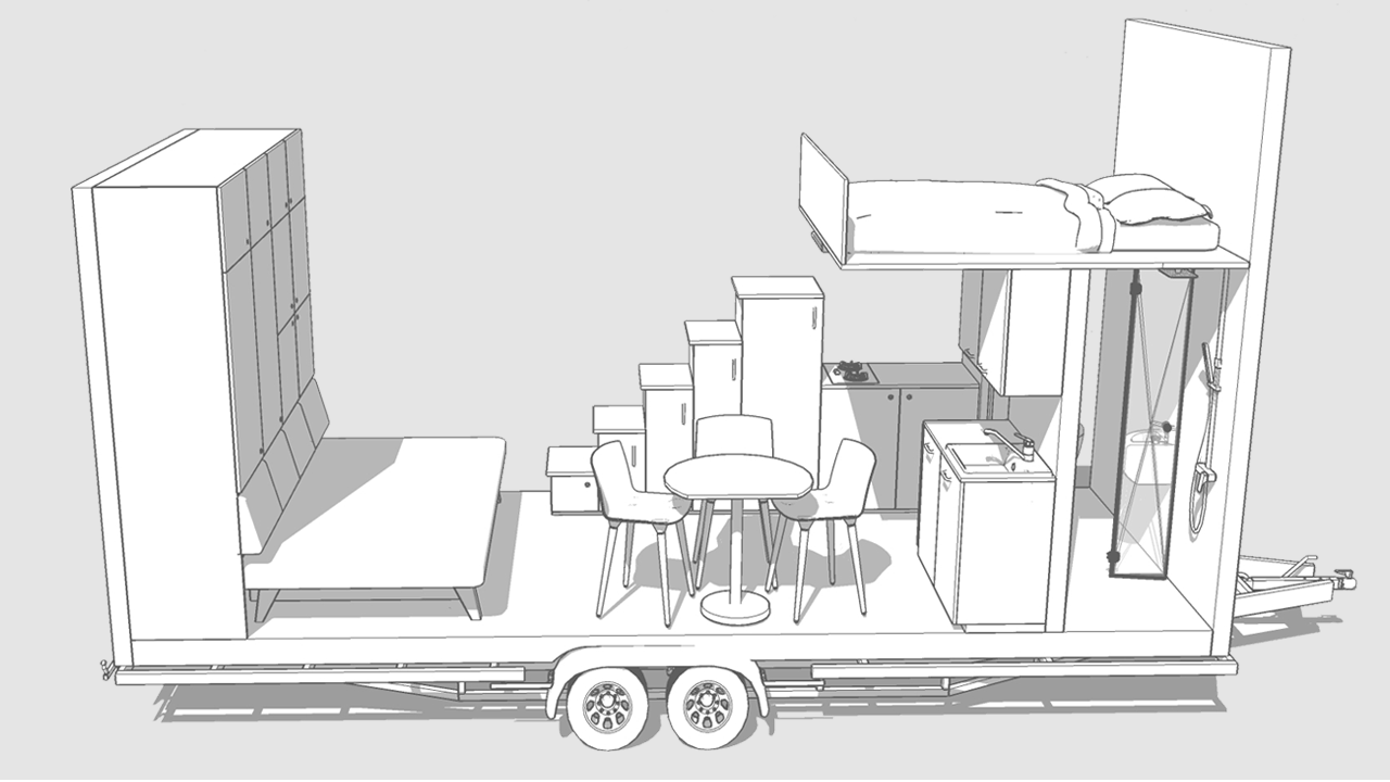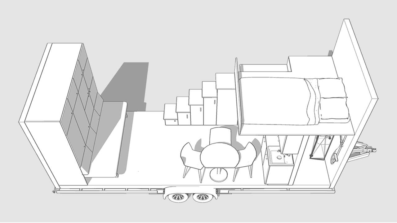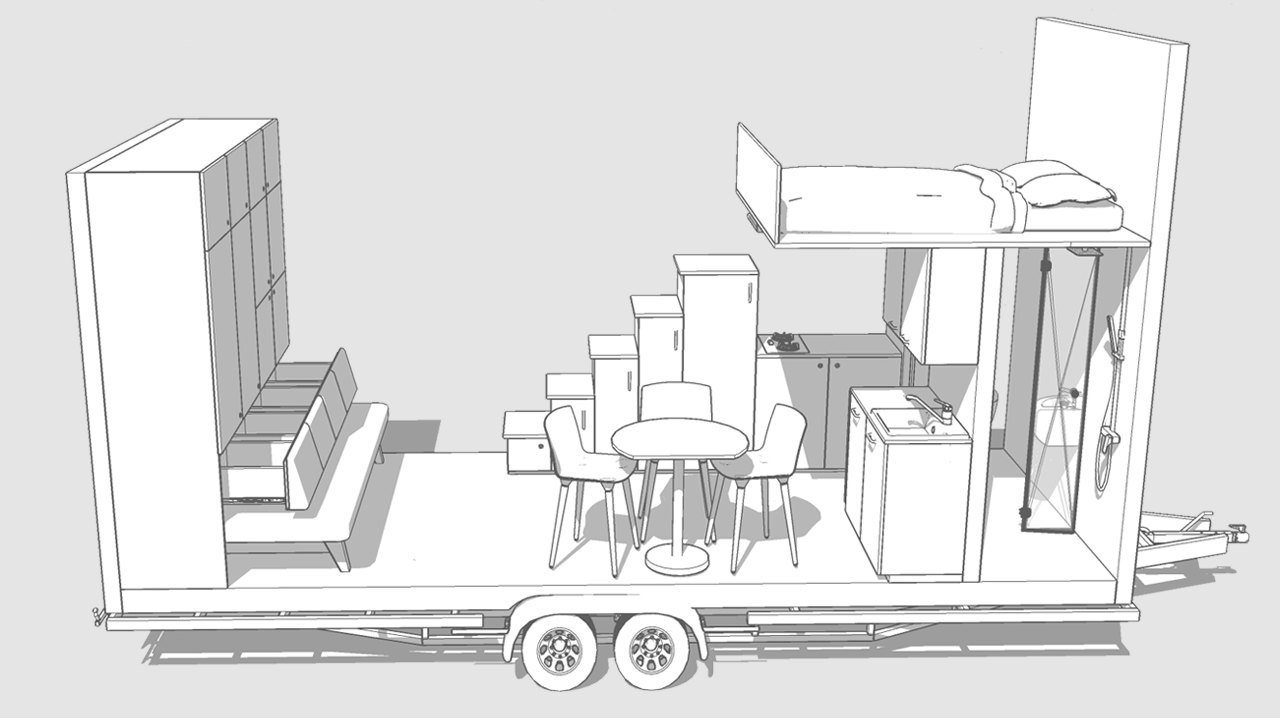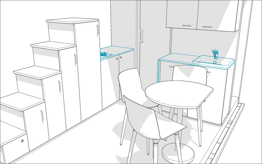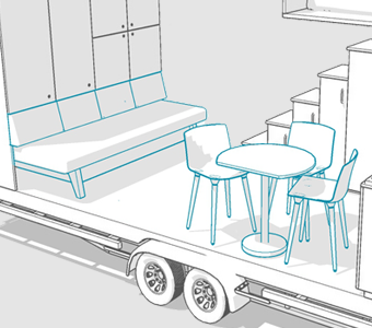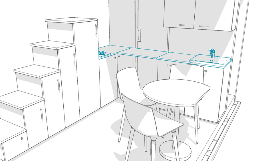 Bolączką większości Tiny House na kołach jest wąska kuchnia i brak stołu do jedzenia oraz integracji. Przeniesienie szafek na tylną ścianę rozwiązało problem wąskiej kuchni i braku stołu.