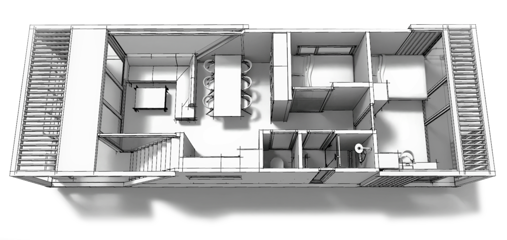 Platforma ma 4×12 co daje 48m2 po podłodze. W tym metrażu otrzymujemy 36m2 powiedzeni mieszkalnej. 2x sypialnia 1x miejsce do pracy i duży salon z aneksem kuchenny. 7m2 tarasu na dole i 25m2 tarasu na dachu. Nie jesteśmy związani z gruntem więc możemy zmieniać miejsce postoju.