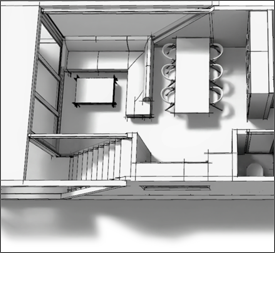 Kuchnia jest usytuowana w wnęce obok ścieżki komunikacyjnej, więc osoby, które pracują w kuchni oraz inni użytkownicy przestrzeni w salonie nie wchodzą sobie w drogę, przez co funkcjonowanie jest komfortowe. Blisko też do stołu jadalnego oraz na górny taras przez schody z przodu obiektu.