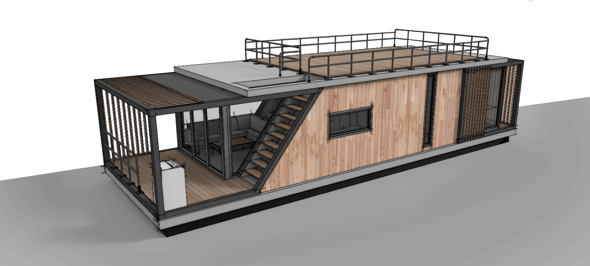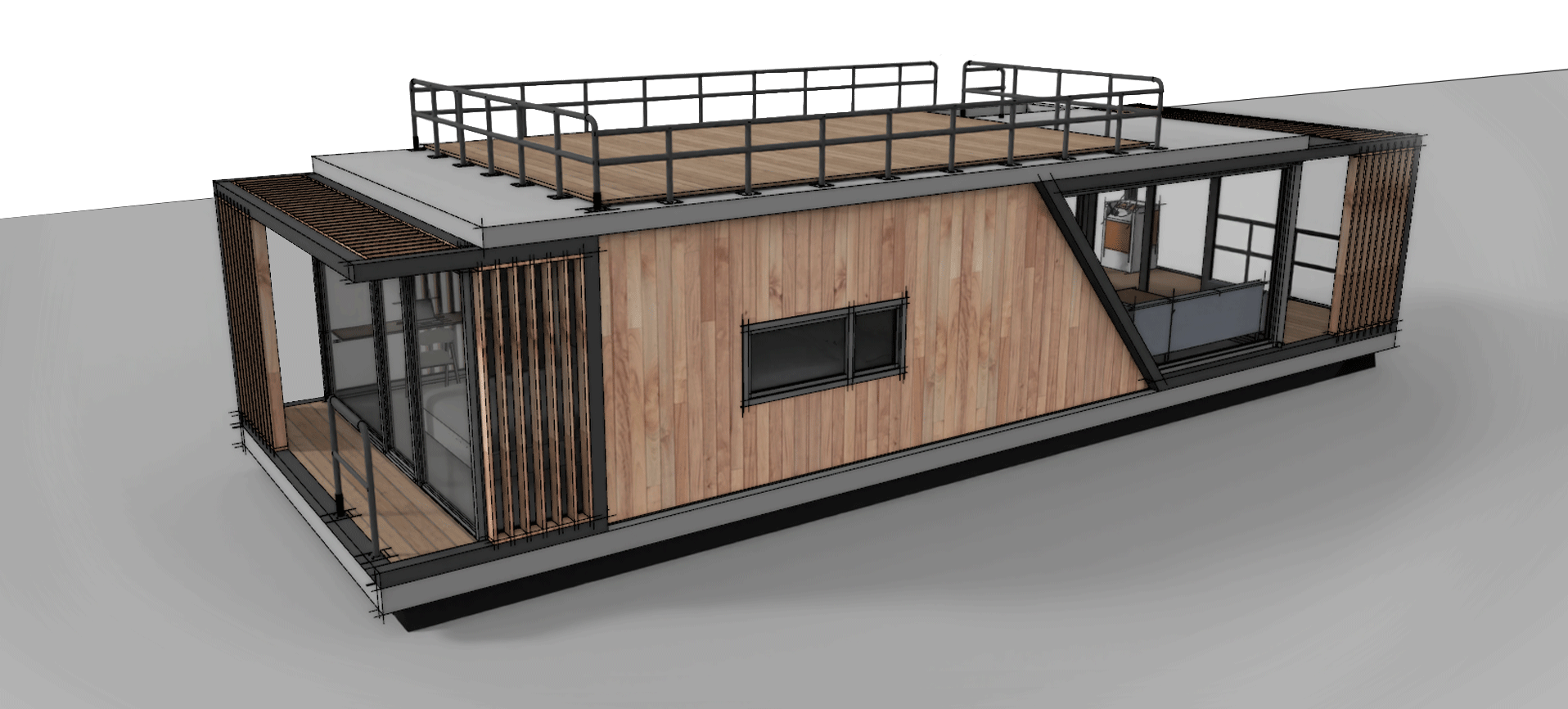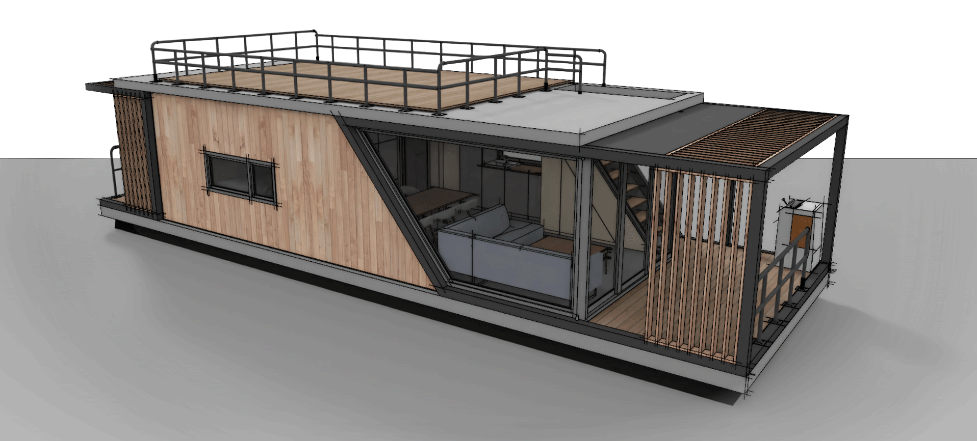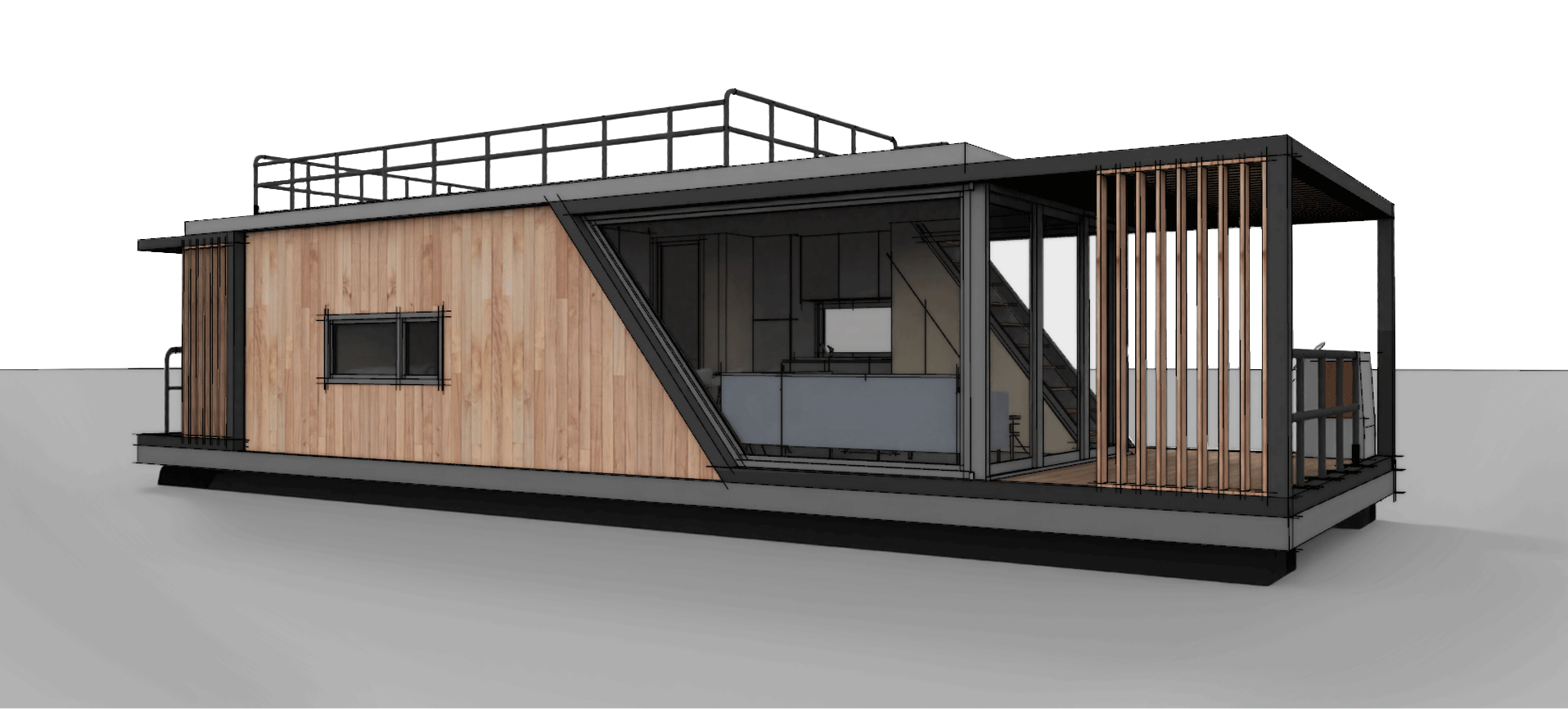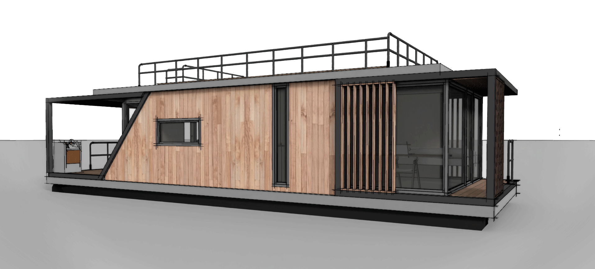 W projekcie znalazły się dwa skośne okna. Jedno większe, drugie mniejsze od strony schodów. Skośne okna nadają dynamiki kwadratowej bryle budynku, przez co nie jest tak nudny i oczywisty jak większość House Boat o prostokątnej bryle.
