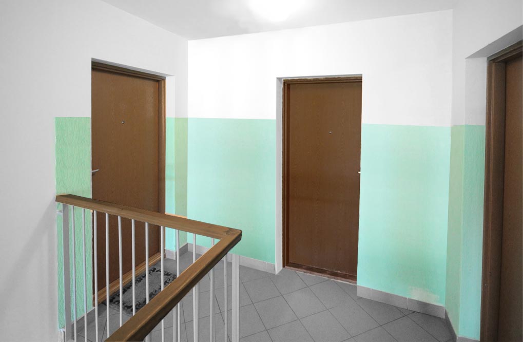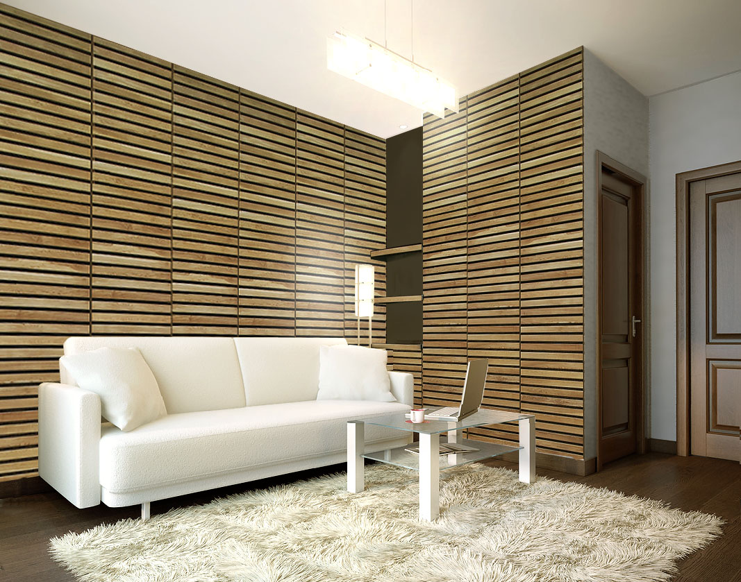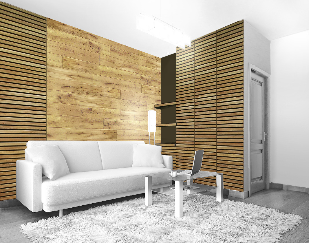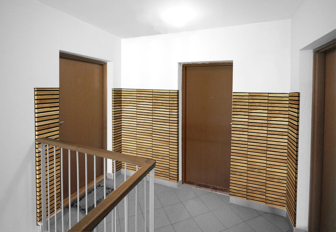 Efekt nowoczesne boazerii na klatce schodowej i na ścianie salonu.