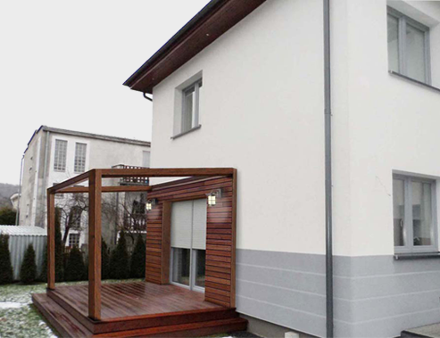 Taras w połączeniu z elewacją drewnianą i konstrukcją z drewna.